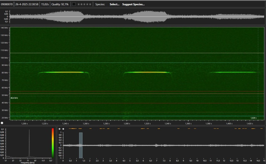 1. Eén van de sonogrammen van de waargenomen grote hoefijzerneus voor de Oudberggroeve – 26 april 2025. Dit was echt een kippenvel momentje voor zowel Roel als collega Koen van Veen. Lees meer over deze waarneming in de VLEN nieuwsbrief 91 van december 2025.